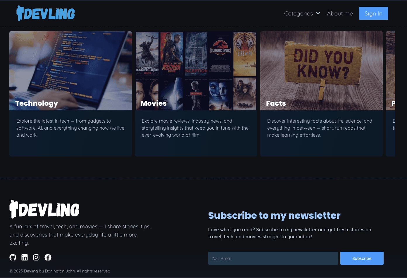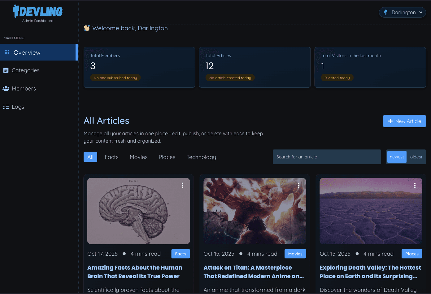 Devling is a modern, role-based content publishing platform designed for dynamic article management and community engagement. Built with Next.js and TypeScript, it offers a structured system where content is organized into categories, each containing multiple articles and categorized for better discovery. The platform supports a multi-role hierarchy — Readers (unauthenticated users) can explore content freely and drop anonymous comments. Members (authenticated users) can comment with their identity visible, and also receive direct email messages from admins. Admins are elevated members who can write articles, manage categories, and oversee user engagement, though only Super Admins can publish their work. Super Admins have full control — managing everything from content publication and comment moderation to blocking users by email or IP, promoting or demoting admins, and deleting posts or comments when necessary. Creating new content is effortless — from the Overview page, users can easily create categories by clicking the “New Category” button, which opens a popup with fields for a name, description, and preview image. Once created, the category becomes available app-wide. Publishing an article instantly makes it visible on the user’s side, while featuring an article highlights it prominently on the hero section of the home page, giving admins and super admins flexible control over content visibility. Devling blends clean design, functional depth, and role-based access control to create a professional-grade publishing experience — perfect for teams, communities, or individuals who want a platform that’s simple for readers but powerful for creators and moderators.