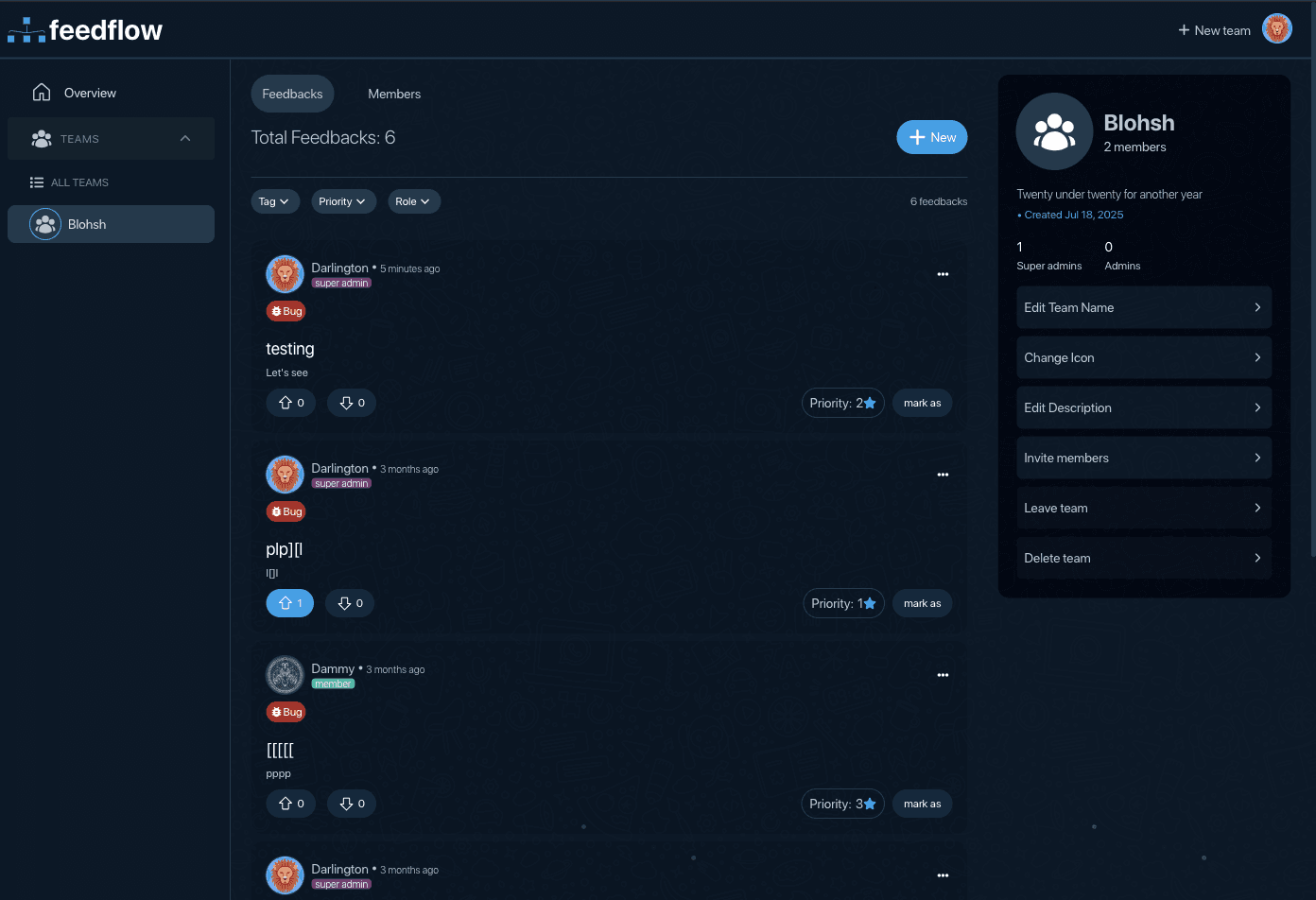 FeedFlow is a full-stack app built for collecting and managing feedback within a team. It allows users to post feedback (like bugs, feature requests, or suggestions), react to others’ feedback, and collaborate.. Users can create teams, invite other members, manage roles, and keep track of all the feedback related to that team. It’s ideal for internal product teams, but also works for public feedback collection.